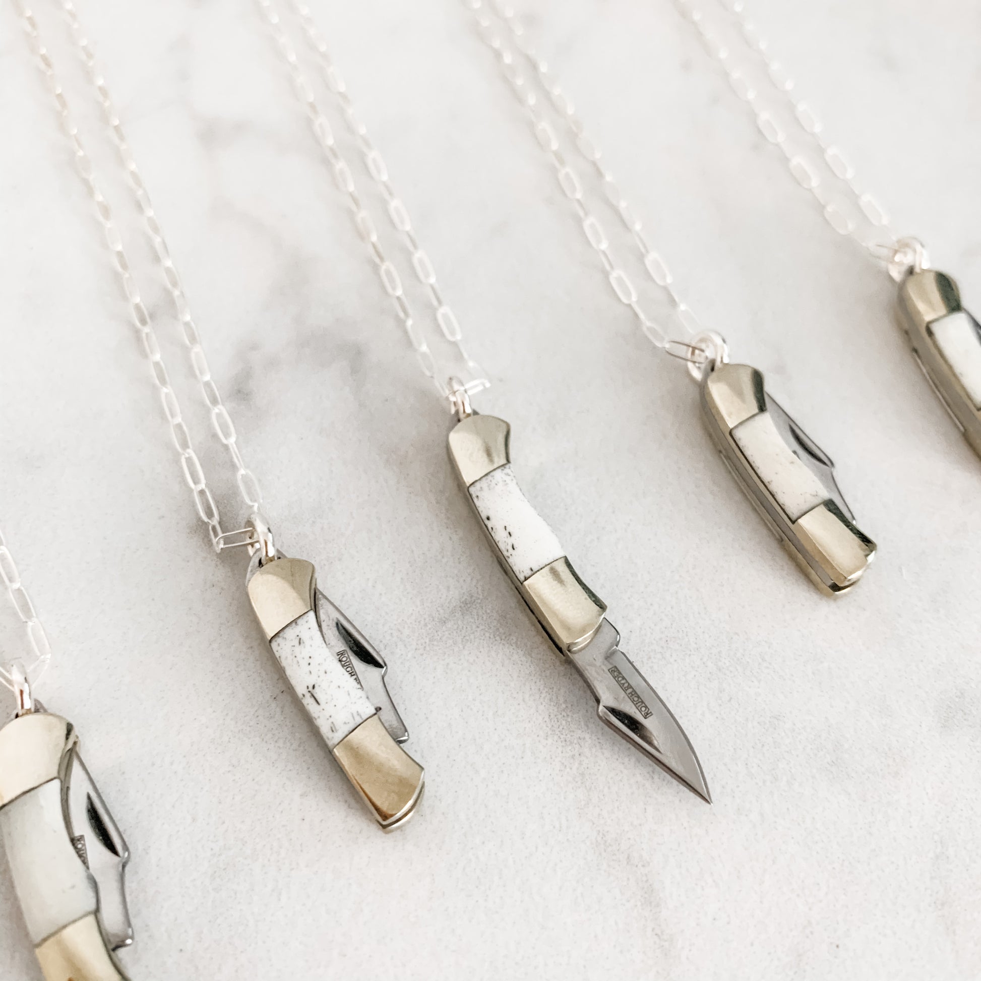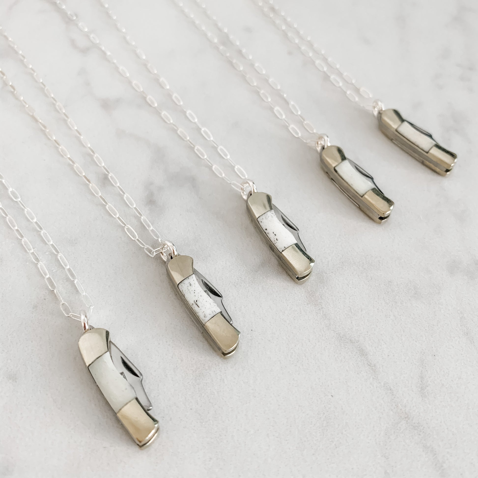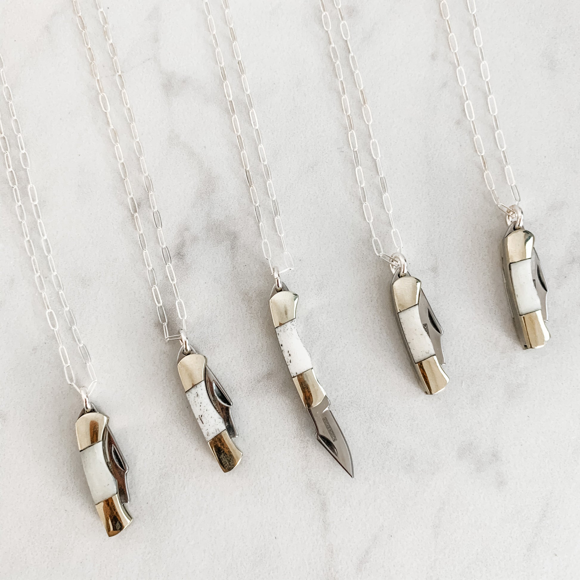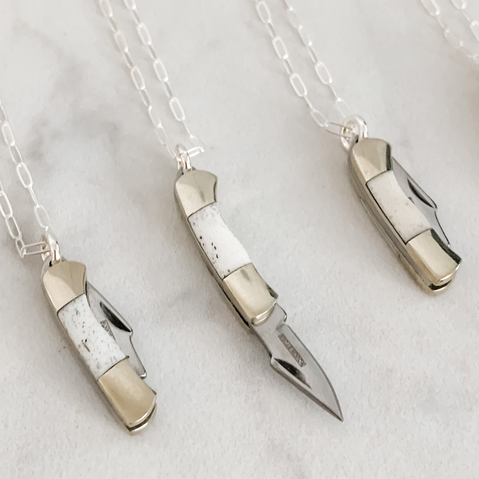 1" Brass and Stainless Steel Blade with Bone Inlay on 20" Sterling Silver link chain.