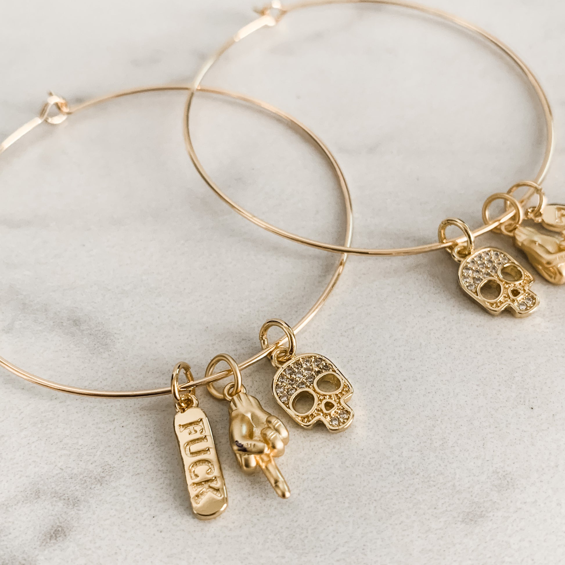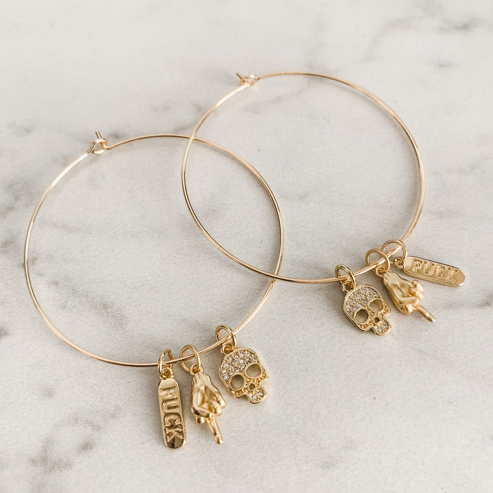 Gold Filled 2” hoops. Featuring Gold Filled Charms; matte gold middle finger pendant, "fuck” gold stamped charm and pave skull charm.